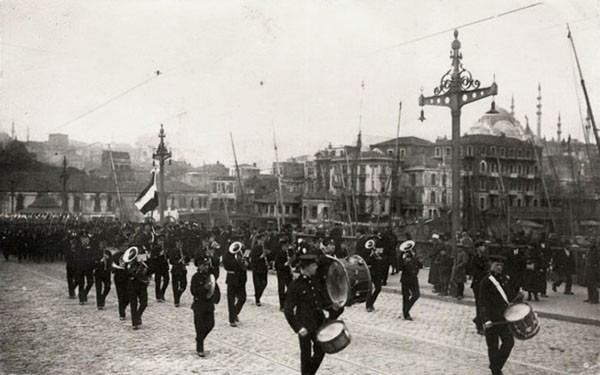 İşgal gemisi bandosu ve denizciler Galata Köprüsünden geçerken. Şubat 1920