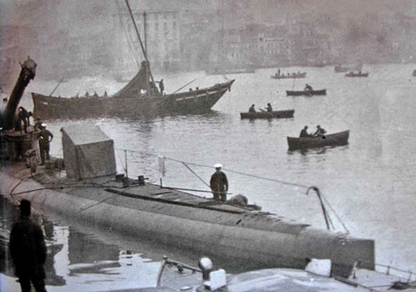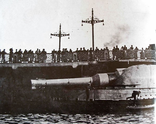 12 İnçlik devasa bir topu bulunan M1 tip İngiliz denizaltısı, Galata köprüsü önünde. Bu denizaltılarda bir tasarım hatası bulunmaktaydı ve top ateşlendikten sonra içerdeki cihazlara ciddi hasar veriyordu. İşgalciler bunun farkındaydılar. Onların niyeti, bu dev denizaltıyı gösterip halkın psikolojisini çökertmekti.