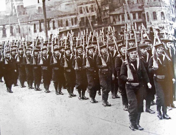 Atlantik filosu denizcileri şehirde yürüyorlar. Şubat 1920
