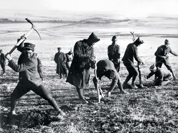 Yunan askerleri dikenli tel örgülerle tahkimat hazırlarken. (1919)