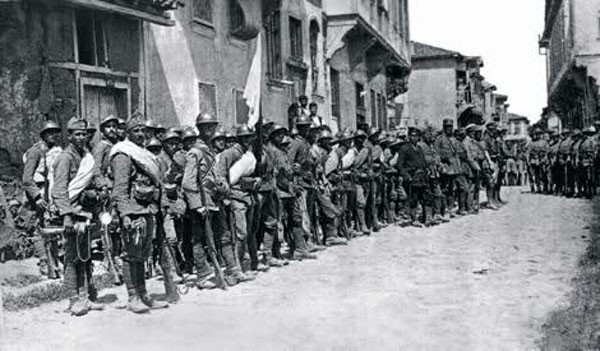 İşgal kuvvetlerine bağlı bir İtalyan birliği talim sırasında, Resim, Amerikan San Francisco Examiner gazetesinden alınmıştır.