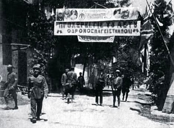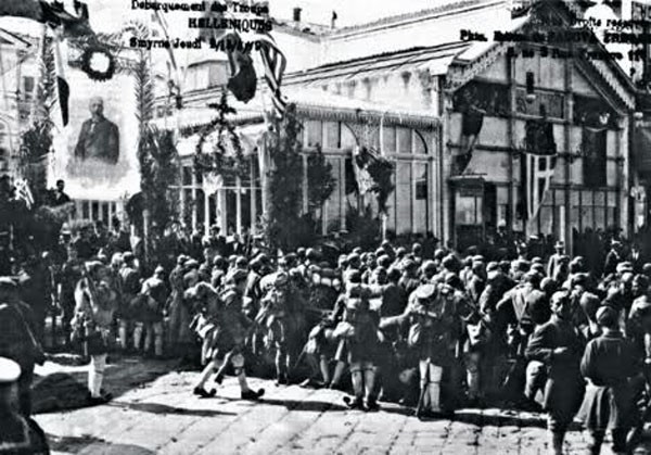 Yunan işgal kuvvetleri İzmir’de. İzmir sahilleri Yunan bayraklarıyla süslenmiş. Soldaki bez pankartta dönemin Yunanistan Başbakanı Venizelos’un resmi görülüyor (15 Mayıs 1919).