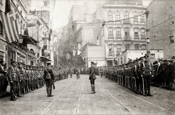 Karaya çıktıktan az sonra Fransız General D’Esprey bir kortej eşliğinde Galata’dan Pera’ya (Şişhane’ye doğru) ilerliyor. 8 Şubat 1919.