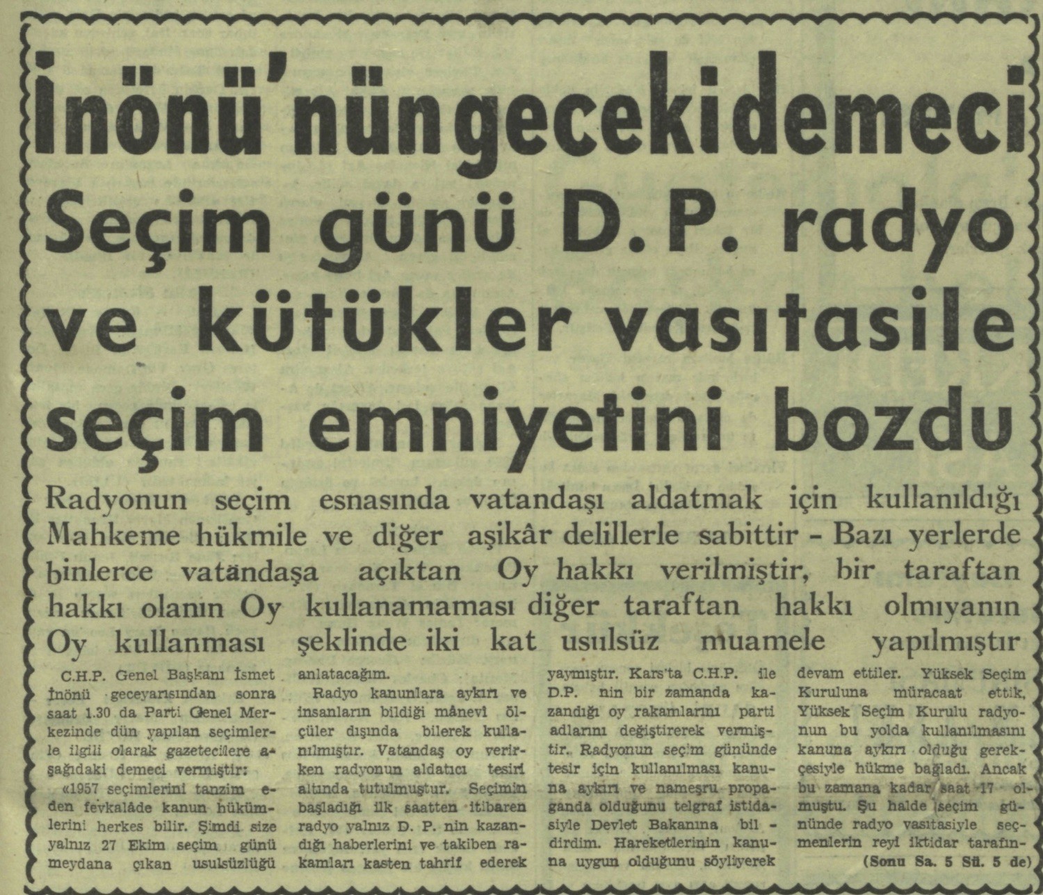 CHP bu kez Yüksek Seçim Kurulu'na başvurdu. Radyo yayını durduruldu. Fakat DP zaten istediğini almıştı; kimi CHP'liler “DP kazandı” diye sandığa gitmedi.