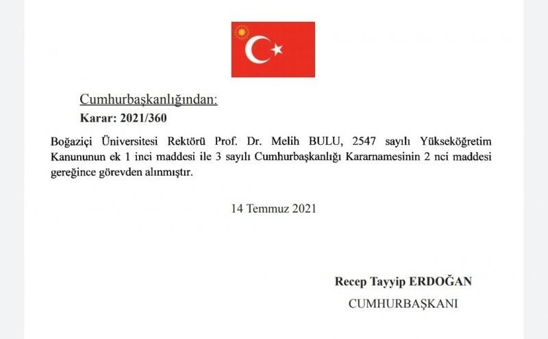 Boğaziçi Üniversitesi Rektörü Melih Bulu, 2547 sayılı Yükseköğretim Kanunu ve 3 sayılı Cumhurbaşkanlığı Kararnamesi gereğince görevinden alındı. Bulu'nun yerine herhangi bir atama gerçekleşmedi.