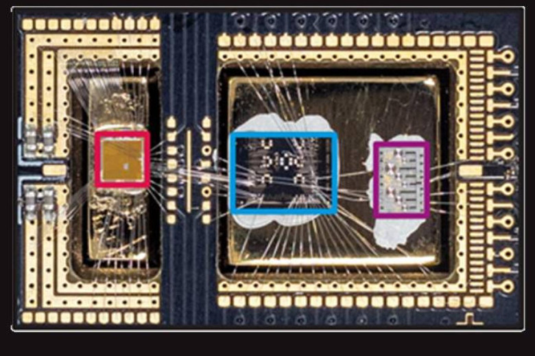 Bir Microsoft kuantum bilgisayarındaki kübit test çipi (mavi) (Microsoft)