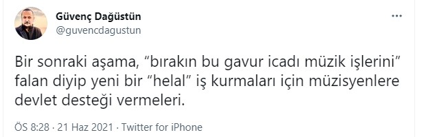 Erdoğan’ın koronavirüs tedbirlerine ilişkin yaptığı açıklamada sarf ettiği ”Müzikle ilgili kısıtlamaları 24.00’e çekiyoruz. Kusura bakmayın gece kimsenin kimseyi rahatsız etme hakkı yoktur” sözlerine müzisyenler tepki gösterdi.