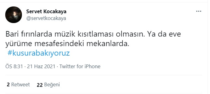 Erdoğan, Cumhurbaşkanlığı Kabine toplantısı sonrası yaptığı açıklamada 1 Temmuz’dan itibaren sokağa çıkma kısıtlamalarının tamamen kaldırıldığını açıklarken; “Müzikle ilgili kısıtlamayı 24:00’e çekiyoruz. Kusura bakmayın, gece kimsenin kimseyi rahatsız etme hakkı yok” ifadelerine de imza atmıştı.