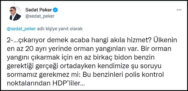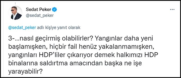 Peker, ülkenin çok sayıda noktasında devam eden yangınlara ilişkin yaptığı paylaşımlarda, HDP'lilerin suçlanmasına tepki gösterdi.