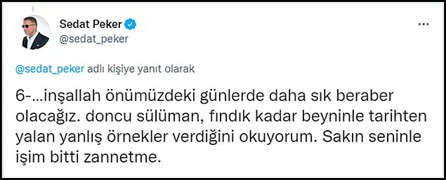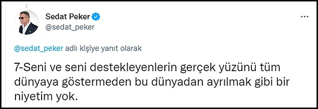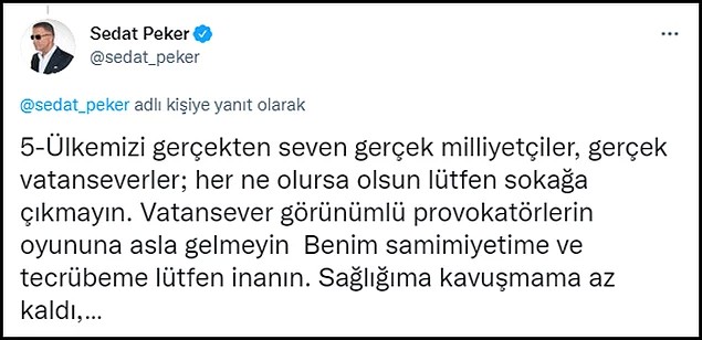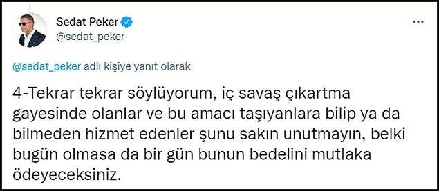 Peker, iç savaş çıkartılmaya çalışıldığı iddiasını yinelerken "Tekrar tekrar söylüyorum, iç savaş çıkartma gayesinde olanlar ve bu amacı taşıyanlara bilip ya da bilmeden hizmet edenler şunu sakın unutmayın, belki bugün olmasa da bir gün bunun bedelini mutlaka ödeyeceksiniz" ifadesini kullandı.