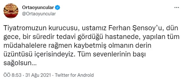 Ortaoyuncular paylaşımlarında "Tiyatromuzun kurucusu, ustamız Ferhan Şensoy’u, dün gece, bir süredir tedavi gördüğü hastanede, yapılan tüm müdahalelere rağmen kaybetmiş olmanın derin üzüntüsü içerisindeyiz. Tüm sevenlerinin başı sağolsun…" dedi.