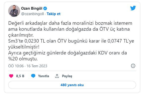 Vergi uzmanı Ozan Bingöl ise Twitter'dan ÖTV zammına ilişkin değerlendirmesinde "Değerli arkadaşlar daha fazla moralinizi bozmak istemem ama konutlarda kullanılan doğalgazda da ÖTV üç katına çıkarılmıştır. Sm3’te 0,0230 TL olan ÖTV bugünkü karar ile 0,0747 TL’ye yükseltilmiştir! Ayrıca geçtiğimiz günlerde doğalgazdaki KDV oranı da %20 olmuştu.